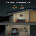 • Güçlü 150 PSI / 10.3 Bar şişirme gücü ile Otomobil, motosiklet, cip ve bisiklet lastikleri, toplar, lastik bot, yatak vb. şişirmek için uygundur,